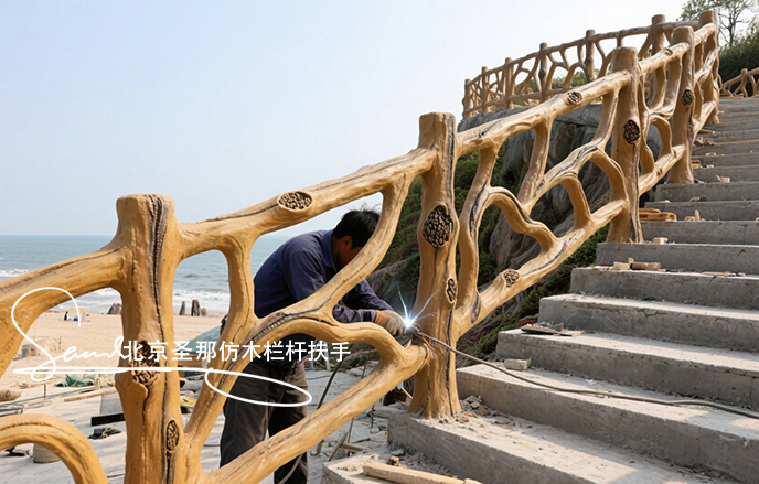 項目描述:現場制作仿木欄桿多用于地形不太平坦的山區旅游景點,參照圖紙用鋼筋直街焊接出大型,外包鍍鋅絲網,把水泥涂上就可以了,然后做出仿木肌理,后上色。