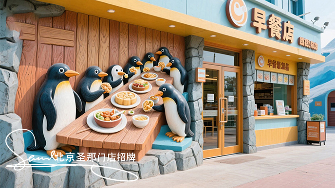 項(xiàng)目描述:門吊招牌以“冰川早餐”為主題,將南冰洞與早餐文化相結(jié)合,營(yíng)造出一幅奇幻的場(chǎng)景:一群企鵝圍坐在冰桌旁用餐。通過(guò)展現(xiàn)可愛(ài)的形象來(lái)突出重點(diǎn)內(nèi)容,便于人們記憶。