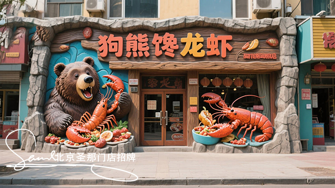 項(xiàng)目描述:門吊招牌以“熊霸的深海盛宴”為核心理念,顛覆傳統(tǒng)海鮮店形象,打造狗熊劫持龍蝦寶藏的奇幻場(chǎng)景,引發(fā)強(qiáng)社交傳播。