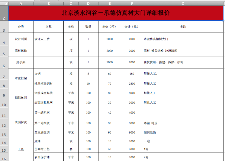 項目描述:仿真樹大門詳細報價按照整個仿真樹大門所用人、材、機的方式報價。其中把材料中的鋼材、水泥、顏色等進行詳細等劃分,細致到每棵仿真樹大門的每個細節所用的人工、材料等,方便以后客戶及同行使用。