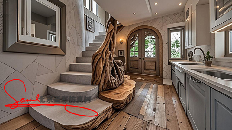 往那兒一看,到頭了就是棵落地仿真樹,窗邊擺著一個好像“沒啥大用”的水泥仿木樓梯螺旋樓梯,把你的眼光帶到屋子外面去。仿真樹被巧妙地設計在了樓層之間的夾層里。而那個五米高的地方,完全可以隔出一個新地方——書房,仿真樹就巧妙地藏在客廳上面的“小閣樓”中。